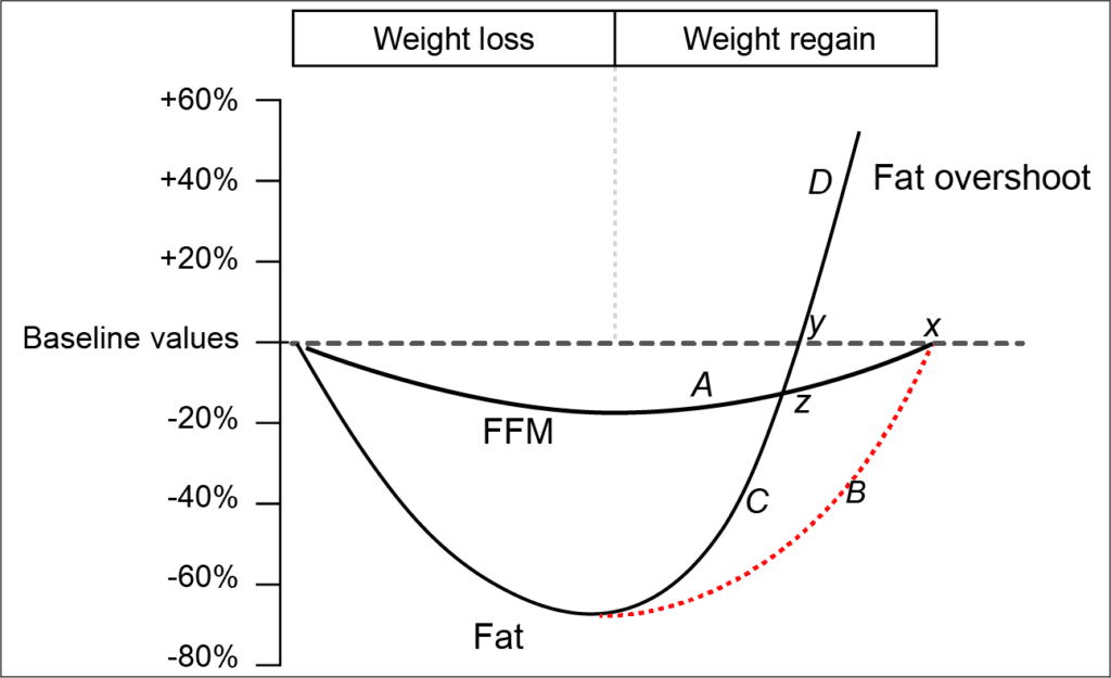 Furthermore, in conjunction with the increased appetite, the body regains fat mass much more quickly than lean mass, ultimately leading to fat overshooting.