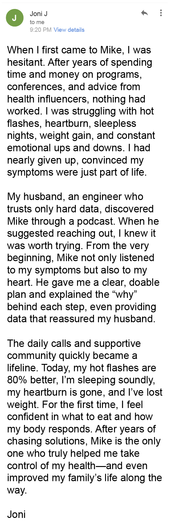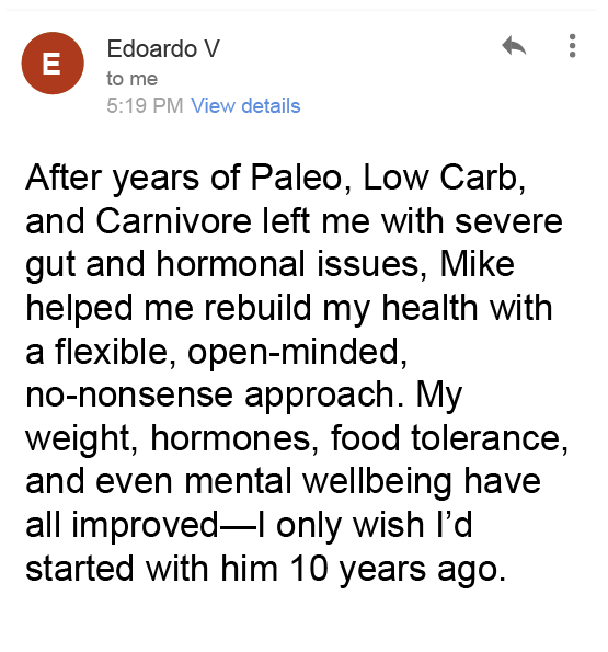 “After years on a strict carnivore diet, I still struggled with stress. Mike’s guidance helped me find a balanced approach to nutrition, and now I’m thriving. So glad I found him!”