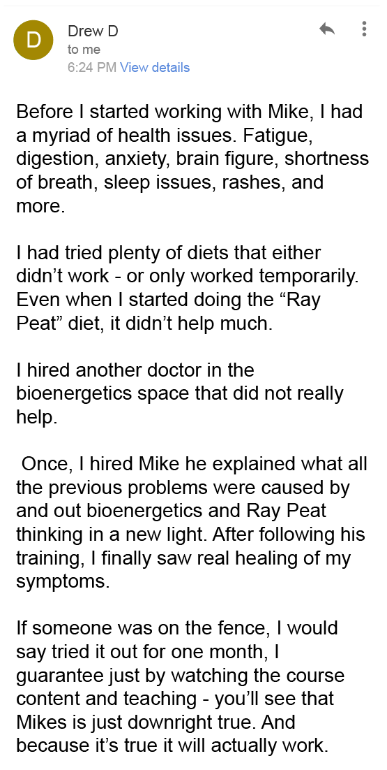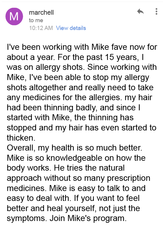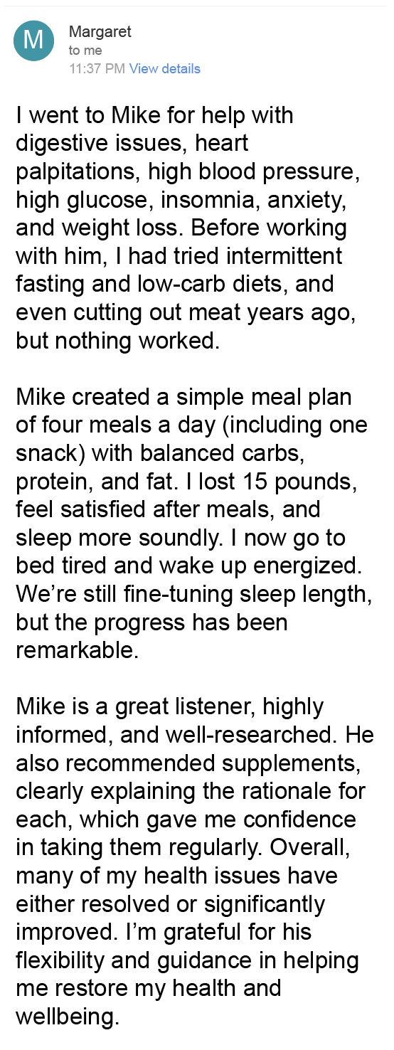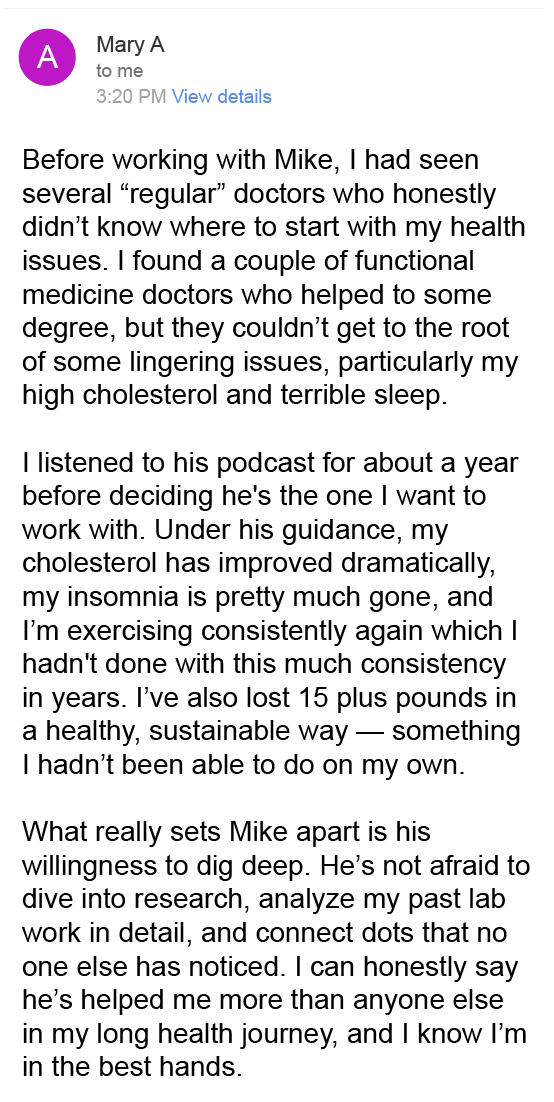 “Mike is an exceptional health coach and independent researcher with unmatched expertise. His deep understanding of biochemical pathways, anatomy, and physiology is remarkable. As a cell and molecular biologist, I’m continually impressed by his ability to translate complex science into personalized, actionable plans that drive real healing. Truly outstanding!”