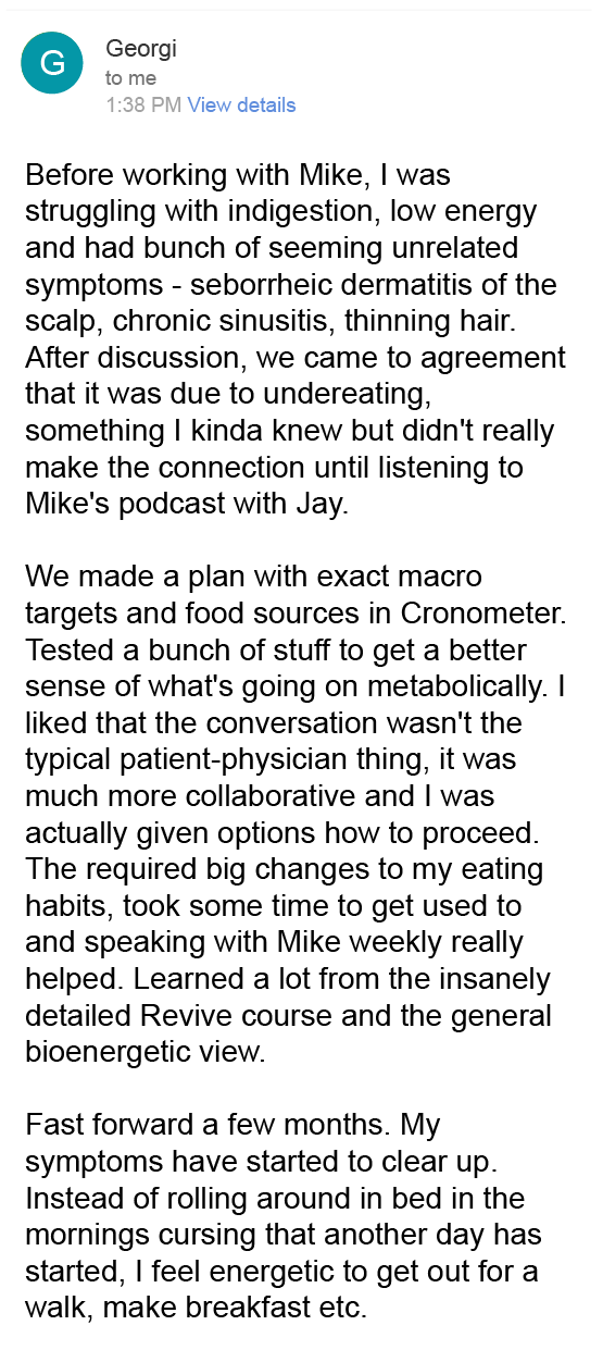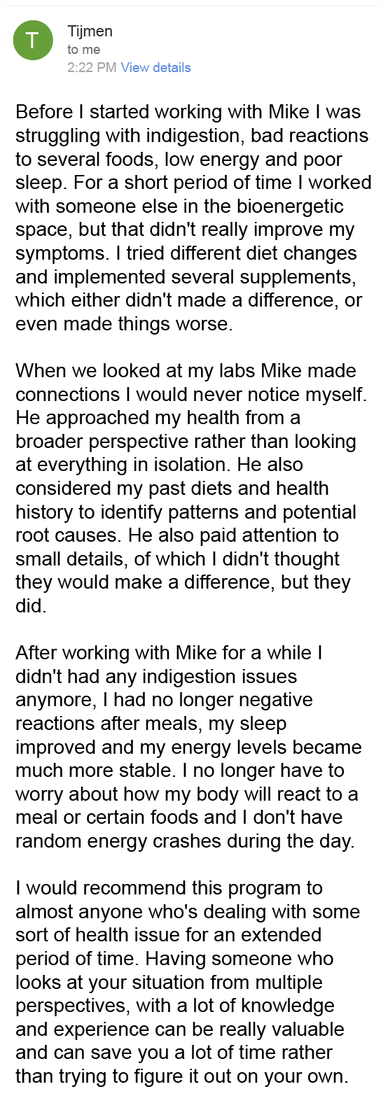 “Mike created a diet and supplement plan… my appetite increased, bloating and acid reflux disappeared, and I finally have energy for the gym.”