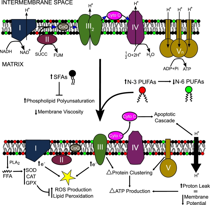 Linoleic acid, an omega 6 polyunsaturated fat that is highly peroxidizable, can be integrated into the cell membrane. This makes the membrane phospholipids more likely to become peroxidized, while also changing the fluidity of the membrane and potentially leading to the leak of protons across the membrane.