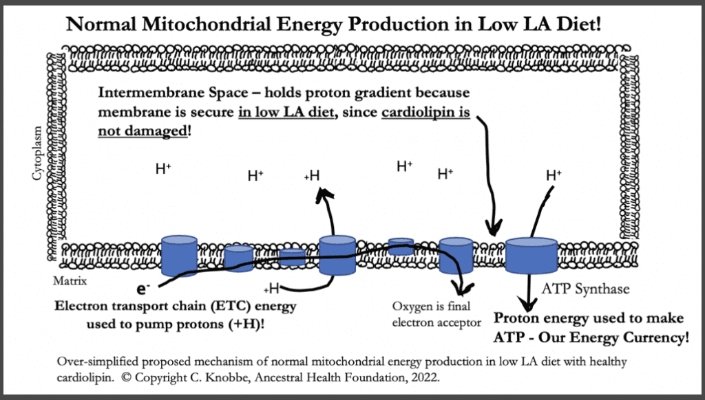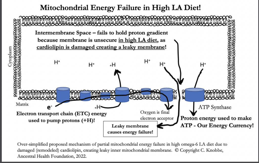 “It is clear that increasing LA consumption in the diet increases the LA in cardiolipin proportionately.964 965 This may increase oxidative stress locally within the mitochondria, leading to oxidation of the LA within the cardiolipin. Thus, even though LA is such a critical component of cardiolipin, it becomes damaged in a high LA diet through oxidation, and either A) undergoes a conformational (“shape”) change, or B) is replaced by another fatty acid (usually the longer chain DHA or AA).”