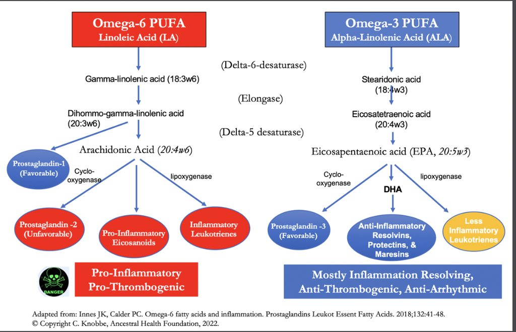 Omega-6 linoleic acid (LA) is a precursor to arachidonic acid, which is a direct precursor to the production of the pro-inflammatory signaling molecules known as the eicosanoids.