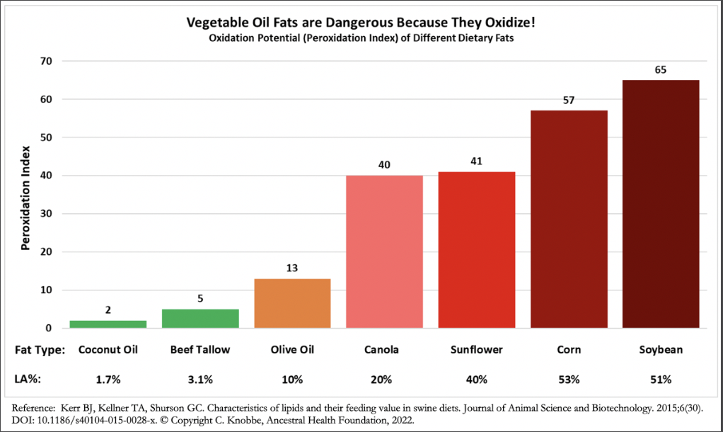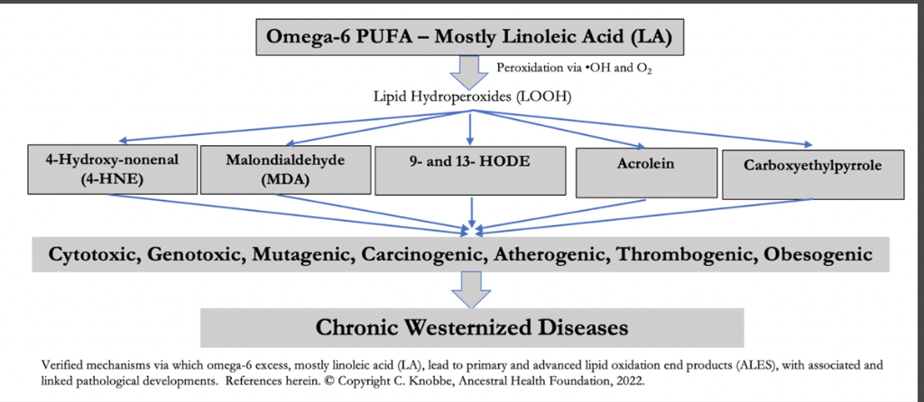 “The problem of excess omega-6 LA in the body is that it is highly subject to oxidation, or what lipid scientists call peroxidation, which is a damaging attack on the double bonds of lipids.870 When LA (and other unsaturated fats) are attacked by free radicals (e.g., hydroxyl radicals, superoxide radicals, hydrogen peroxide, and singlet oxygen), they develop a degenerated and dangerous kind of fat called a lipid hydroperoxide, which can then further degenerate into other downstream products that are even far more dangerous.”