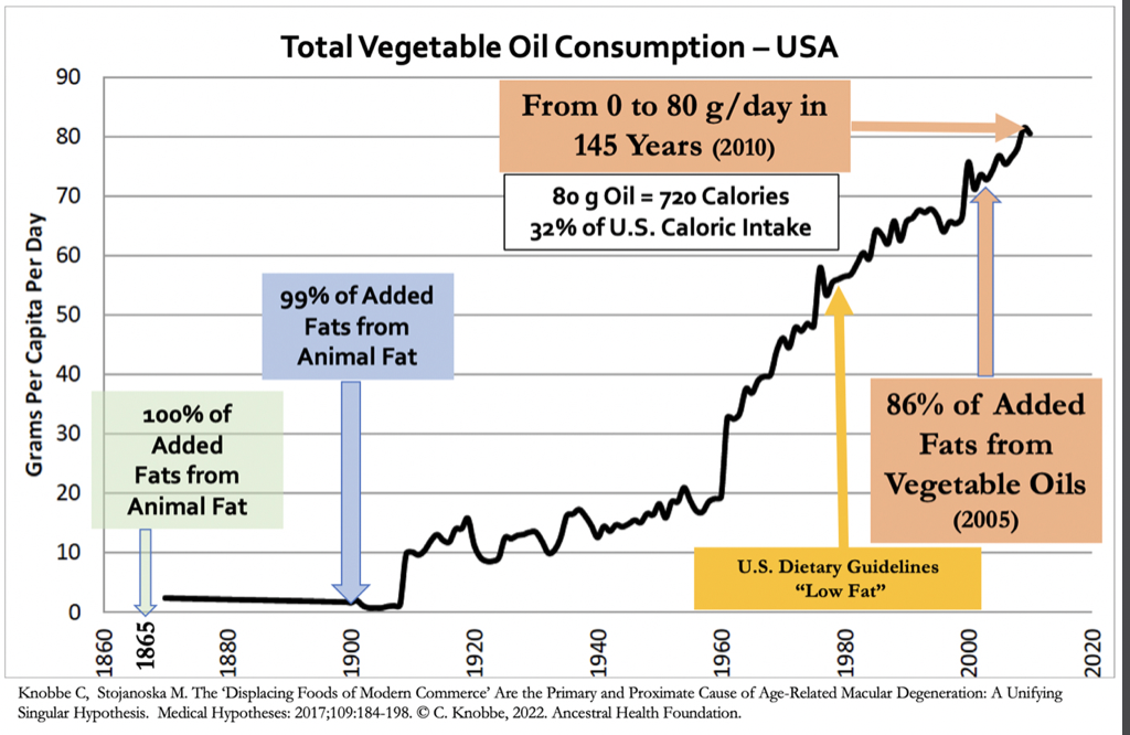Um, macular degeneration, diabetes through the roof, right? But in, in direct correlation to the vegetable oils. That's an interesting point too for the people who are kind of advocating for seed oils and saying that it's just a matter of like energy tech toxicity, and they're just as guilty as far as like, yeah.