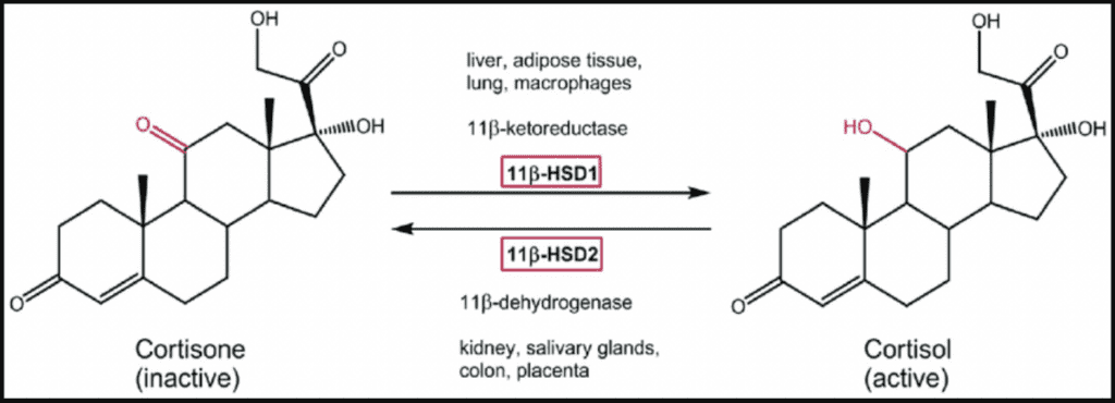 So, I have a graphic here to show us. And so, What we see is we have cortisone on this left side, which is inactive cortisol, and then you have cortisol on this side, which is the active form of glucocorticoid cortisol, and you have the enzymes here, 11 beta HSD1 and 11 beta HSD2. 11 beta HSD2 takes cortisol and turns it into the inactive cortisone, 11 beta HSD1 takes cortisone and turns it into the active form of cortisol.