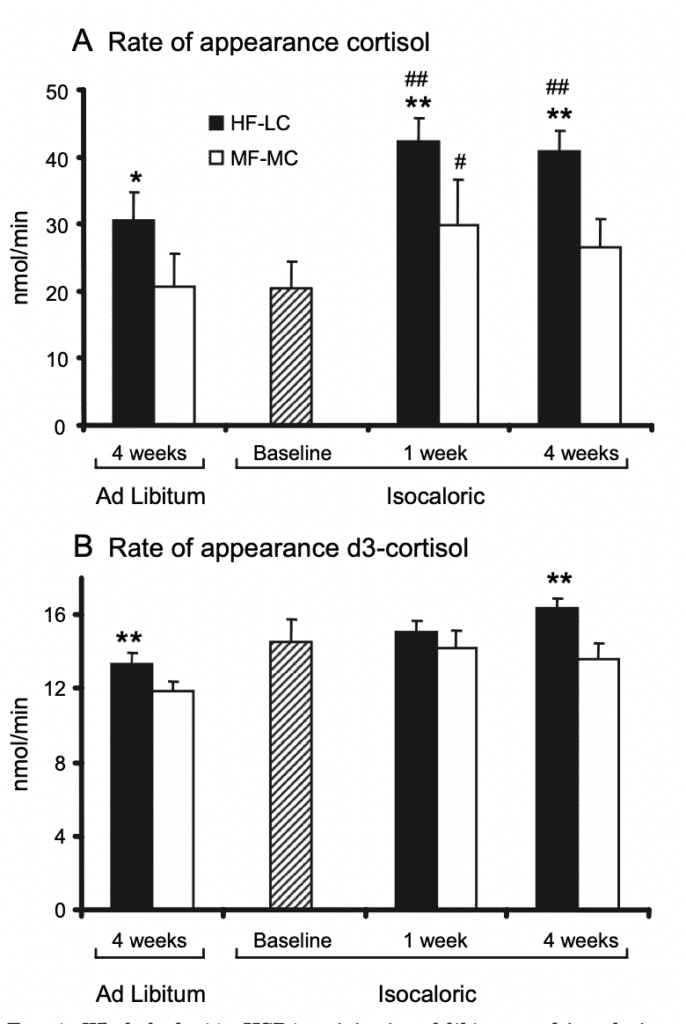 “The increased 11β-HSD1 activity on the HF-LC diet vs. MF-MC diet was independent of energy consumption and weight loss. The same effect was observed under fixed feeding conditions, and the HF-LC effect was already apparent after 1 week.”