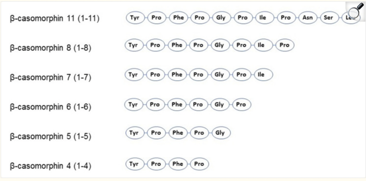 “β-casomorphins (βCMs) are a group of peptides with a chain length of 4–11 amino acids, all starting with the tyrosine residue critical to their opioid activity.”